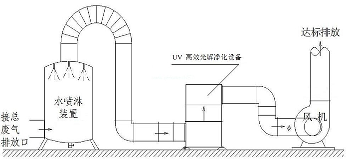 廢氣源→高效吸收塔(吸收掉漆霧、粉塵以及顆粒物為活性炭和光催化提供優(yōu)良的運行環(huán)境)→活性炭吸附塔(吸附部分苯甲苯二甲苯)→光催化設備(紫外線照射空氣產(chǎn)生臭氧氧化廢氣分子利于達標排放)→高壓風機(高壓的吸力作用下持續(xù)將廢氣抽出車間)→煙囪高空排放(也可低空排放)。