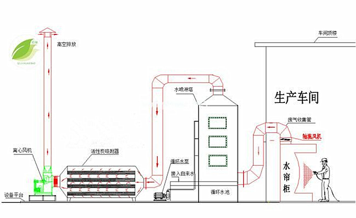 廢氣源→高效吸收塔(吸收掉漆霧、粉塵以及顆粒物)→活性炭吸附塔(吸附部分苯甲苯二甲苯)→→高壓風機(高壓的吸力作用下持續(xù)將廢氣抽出車間)→煙囪高空排放(也可低空排放)。